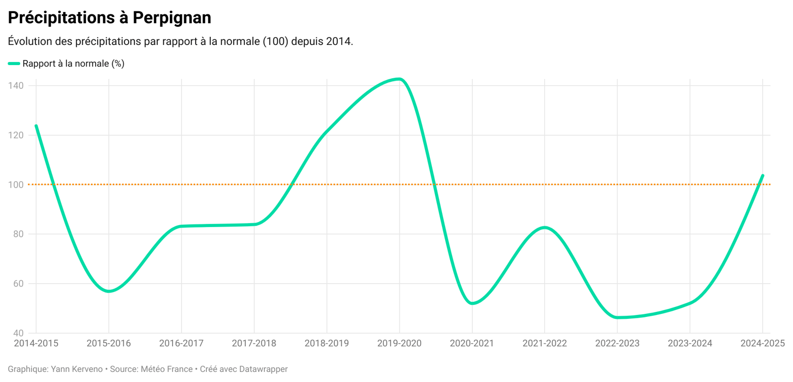 Achevée avec les premières heures de septembre, l’année météorologique 2024-2025 signe un retour (modeste) à la normale avec 599 mm tombés à Perpignan pour une moyenne de 578 mm. Pour autant, difficile de crier victoire. Au cours des quatre dernières années, le déficit cumulé atteint 965 mm, soit près de deux années de pluie… Pour l’ensemble des Pyrénées-Orientales, 2024-2025 est la cinquième année hydrologique déficitaire consécutive avec 798 mm contre 849 pour la normale et depuis 2016, seule l’année 2020 a connu des pluies excédentaires (notamment avec l’épisode Gloria). Seuls les mois d’octobre, mars, juillet et août se sont révélés excédentaires. Mais tout le monde n’est pas logé à la même enseigne. C’est le Vallespir qui s’en sort le mieux au cours des douze derniers mois avec jusqu’à 1 000 mm dans certains endroits contre moins de 500 en Salanque.