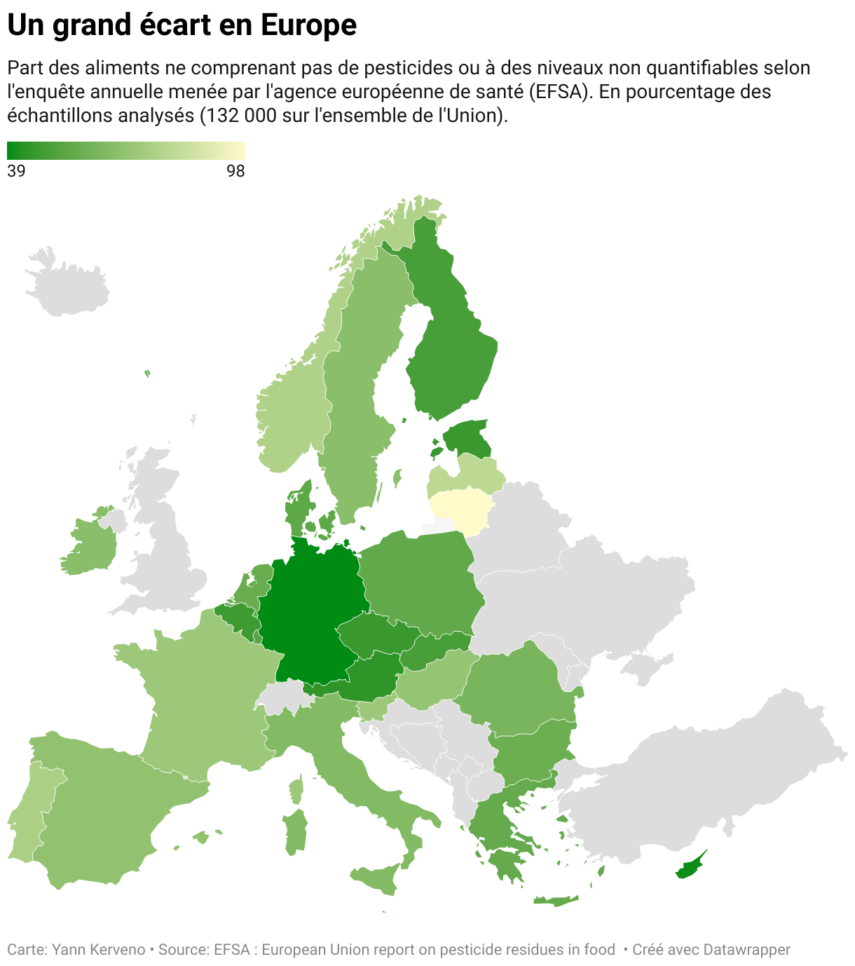 Il a beaucoup été question de pesticides cet été autour de la loi Duplomb et de l’acétamipride. Une controverse qui pourrait donner à croire que le danger est partout dans notre alimentation. Pourtant, les chiffres sont plutôt rassurants. L’enquête annuelle menée par l’Agence européenne de santé sur les résidus de pesticides dans les aliments a permis de tester 132 000 échantillons en 2023. Des produits issus de l’agriculture de l’Union ou venus de pays tiers. 58 % des échantillons ne comprenaient pas (ou en dessous des limites de quantification) de résidus quand 38,3 % en contenait sans que soit dépassée la limite maximale autorisée. Les non-conformités s’élèvent à 3,7 %. La Finlande, la Suède et l’Autriche sont les plus mauvais élèves enregistrant plus de 6 % d’échantillons non conformes. Et pour être complet, sachez la limite maximale de résidus est calculée en fonction de la dose journalière admissible, elle même calculée à partir de la dose sans effet, la quantité maximale d’une substance qui peut être ingérée par un animal quotidiennement, pendant toute sa vie, sans troubles physiologiques. (Source : https://multimedia.efsa.europa.eu/pesticides-report-2023/)